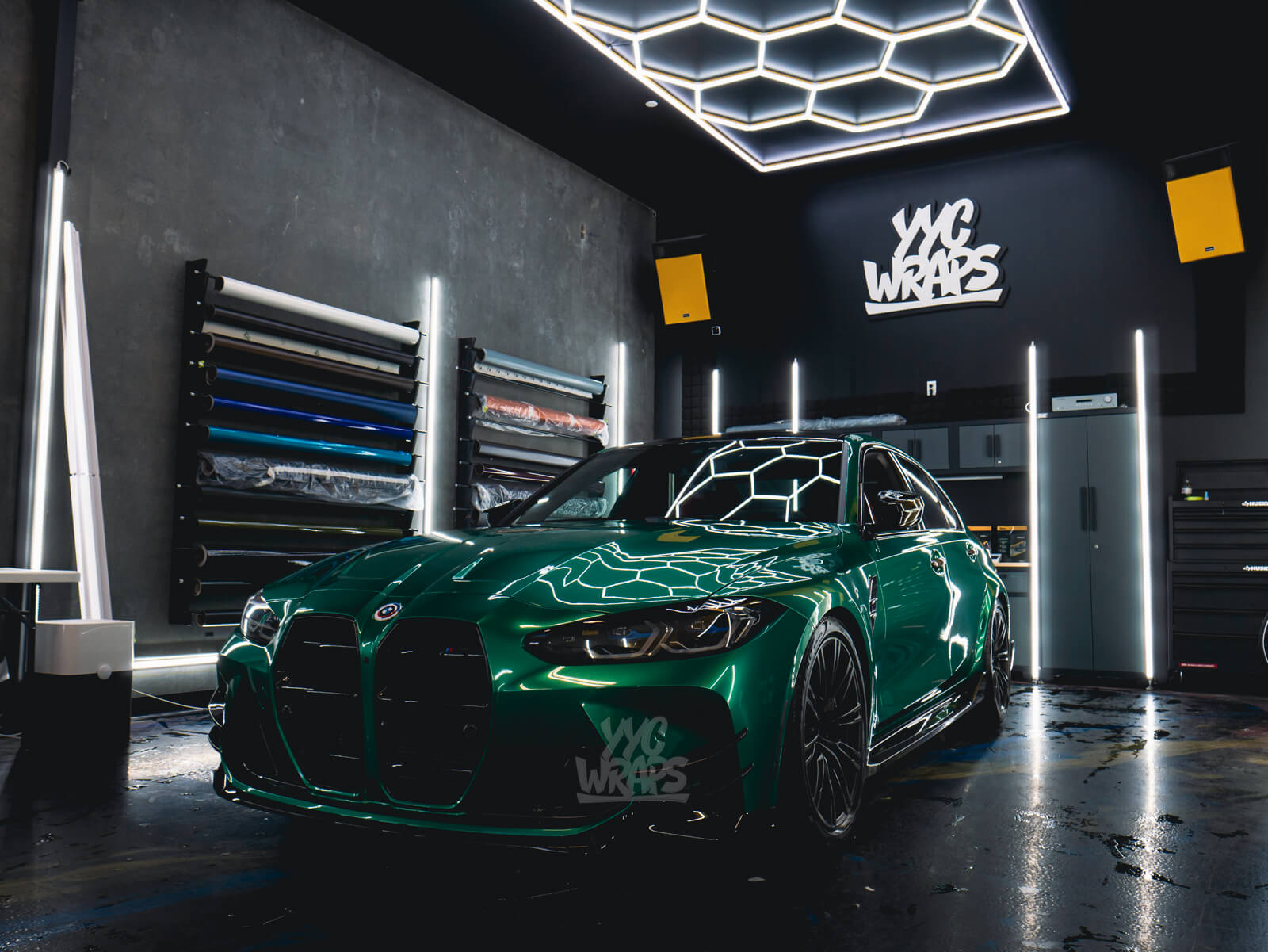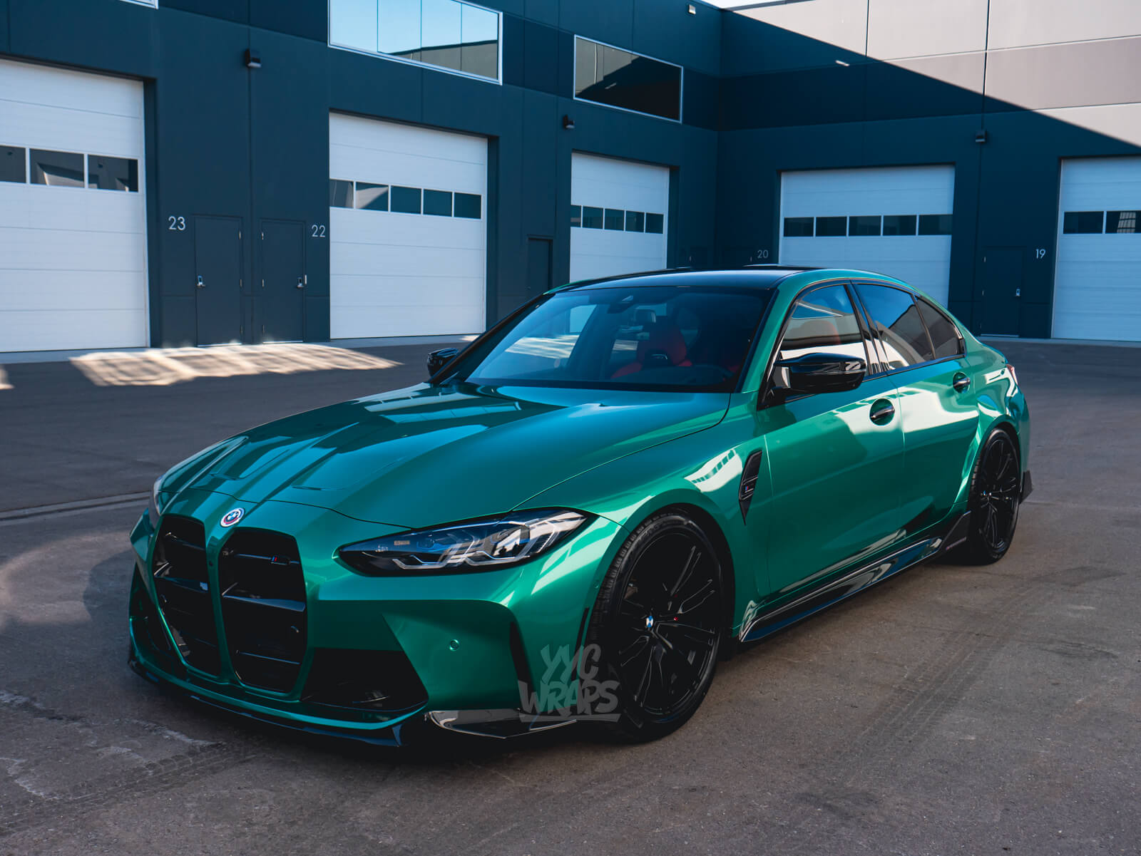 Our customer found this used m3 competition from a private buyer in white. They wanted the notorious Isle of Man green colour and brought it to us to transform the vehicle We vinyl wrapped the exterior from white to green, we also installed Xpel Ultimate Plus PPF on the exterior to protect the Vinyl and painted the Callipers Red for the complete look. We also wrapped the door handles, diffuser and interior aprts in Carbon Fibre. The vehicle turned out great despite difficulties with the Vinyl! All work is completed by seasons professionals at our Calgary BMW Vinyl Wrap studio with decades of install experience without disassembly of the car.